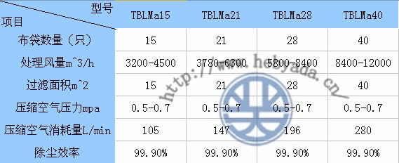 TBLMa系列脈沖式除塵器主要技術(shù)參數(shù)及性能指標參數(shù)表